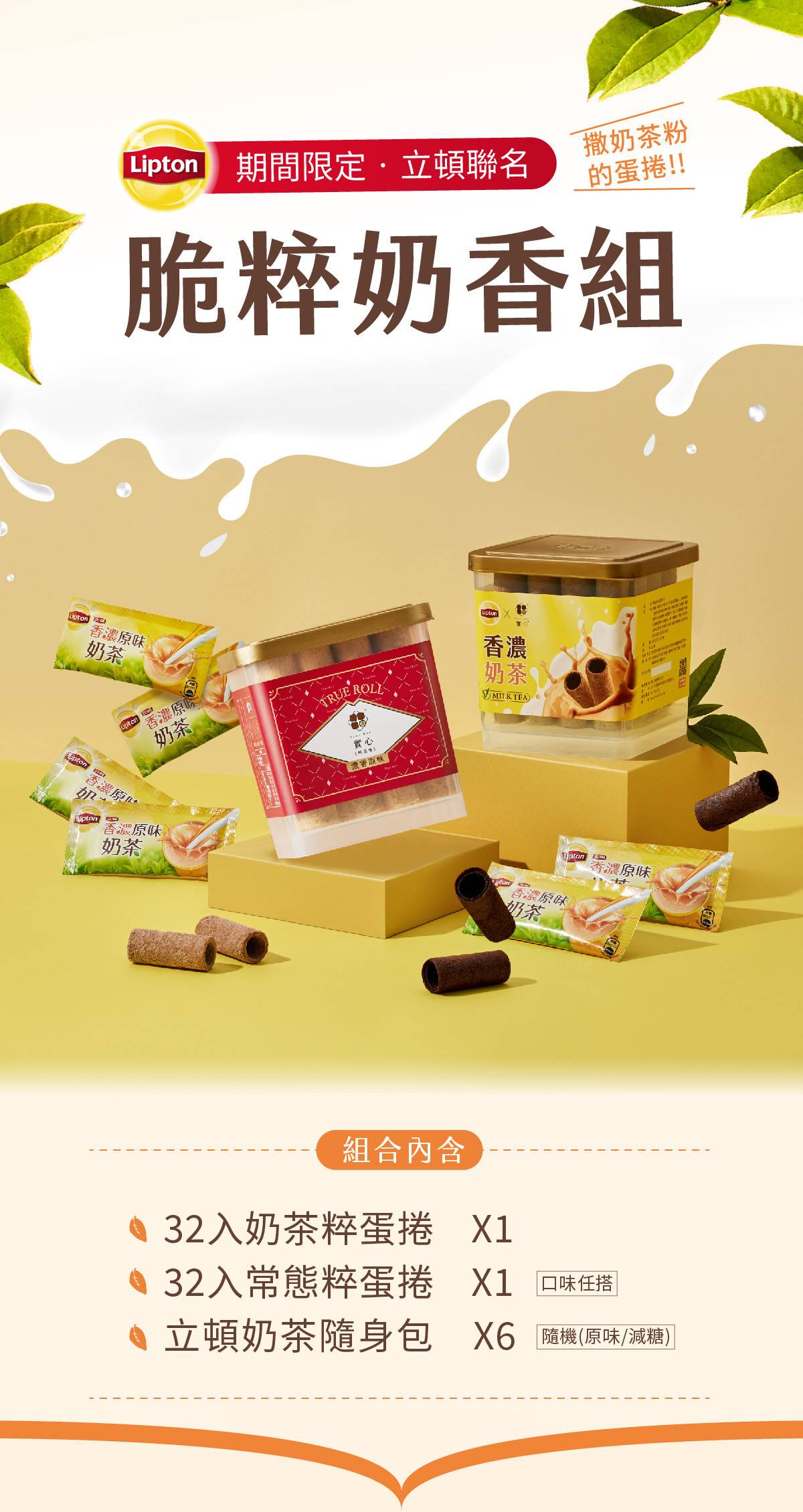 【立頓聯名】脆粹奶香組(香濃奶茶粹蛋捲x1+粹蛋捲32入x1+立頓20g奶茶包x6)